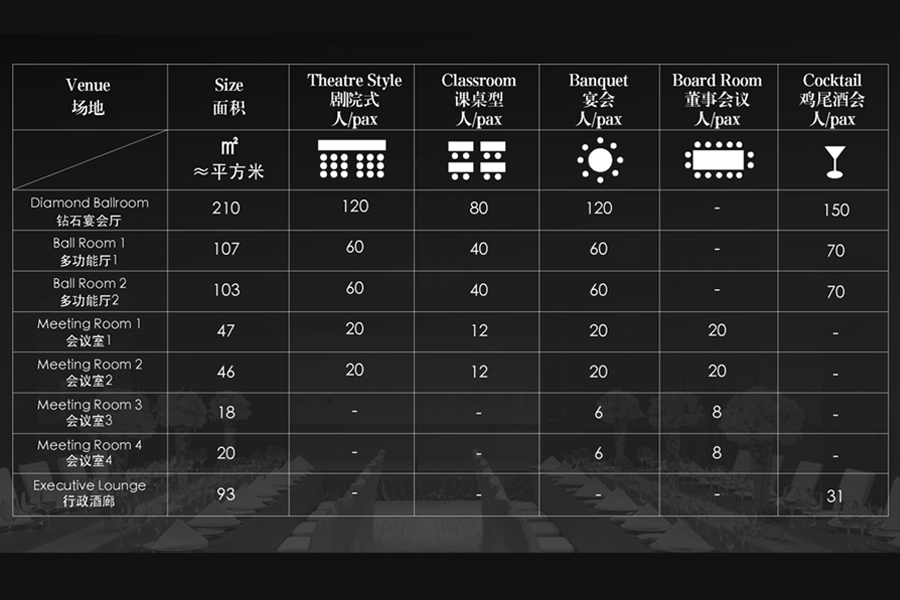 会议及宴会设施位于酒店2楼,包括1个多功能厅和4个大小不一的会议室。还有可用于派对、会议、婚礼和媒体活动的行政酒廊灵动多变空间。多功能厅:210㎡,会议室:18-47㎡。